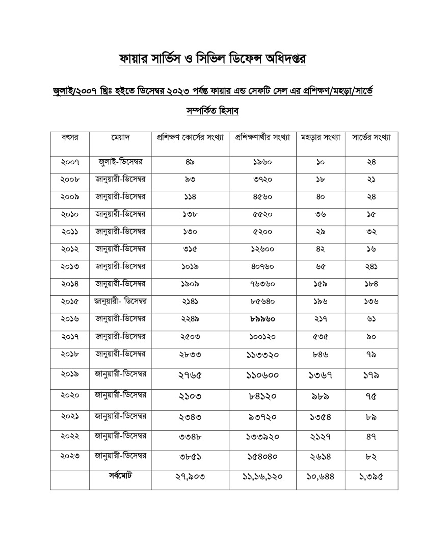 অগ্নি প্রতিরোধ, অগ্নি নির্বাপণ, উদ্ধার, প্রাথমিক চিকিৎসা ও ফায়ার ড্রিল বিষয়ে সম্পন্নকৃত প্রশিক্ষণ কোর্সের তথ্যাদিঃ